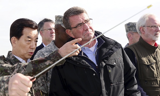| Defense Secretary Ash Carter is briefed by RoK’s Defense Minister Han Min-Koo at observation post inside the truce village of Panmunjom, in the demilitarised zone separating the two Koreas. (Photo: Yonhap/Reuters) |