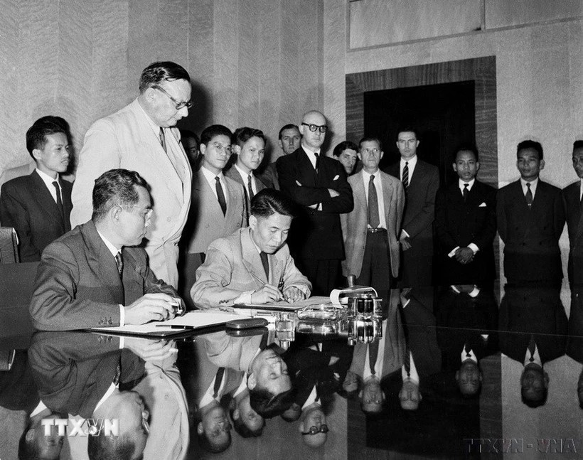 Deputy Minister of National Defense Ta Quang Buu (sitting, right) of the delegation of the Democratic Republic of Vietnam, and French General Henri Delteil, Acting Commander-in-chief of the French Union forces in Indochina, sign the agreement on the cessation of hostilities in Vietnam. (File photo: VNA) |