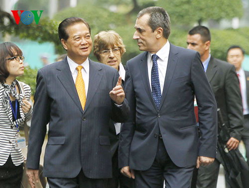 In talks after the welcoming ceremony, Prime Minister Dung thanked the Bulgarian people for their support in Vietnam’s struggle for national liberation. The Bulgarian Prime Minister stressed that Vietnam was Bulgaria’s strategic partner in Southeast Asia. The two Prime Ministers briefed each other on the situation in their respective countries, and discussed bilateral ties and issues of mutual concern. They agreed to further bilateral cooperation in regional and global forums. Vietnamese Prime Minister Dung spoke to reporters after the talks: “We agreed to maintain exchanges at all levels, increase all-round cooperation, especially in economics, education, training, culture, tourism, national defence and security. We aim to increase two-way trade turnover, increase the efficiency of our cooperation, create favorable conditions for both business communities to meet and establish partnerships and expand markets in the areas of mutual interest, such as infrastructure construction, urban development planning, public transport development, the efficient use of energy, environmental protection, and food processing”.