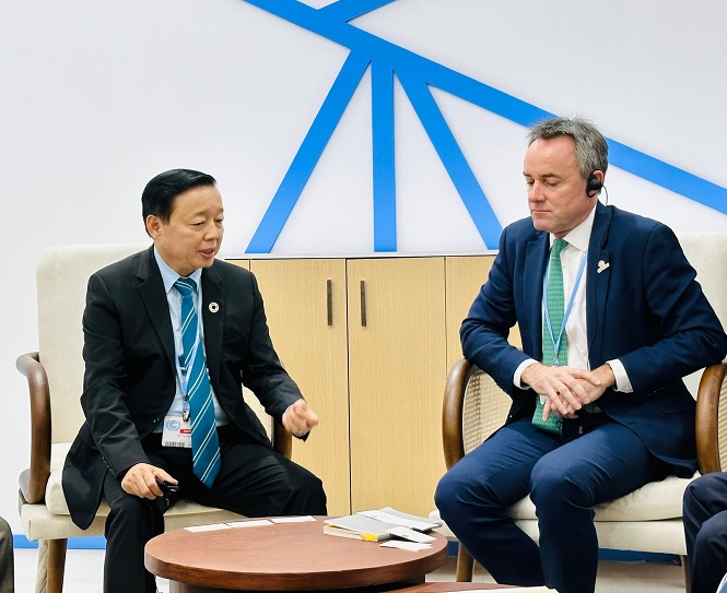 Minister of Natural Resources and Environment Tran Hong Ha talks with Mr. Simon Harford, CEO of the Global Energy Alliance for People and the Planet. (GEAPP). (Photo: baotainguyenmoitruong.vn) |