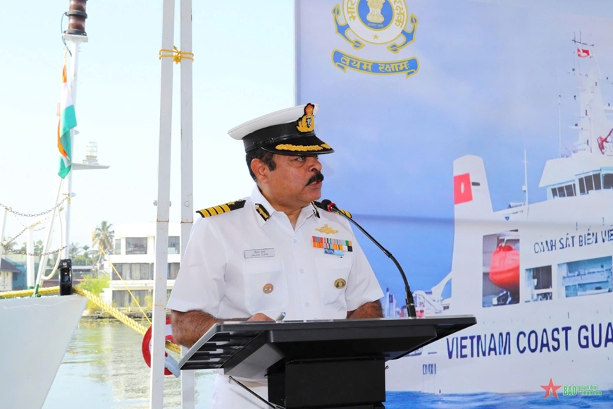 Colonel Shatrujeet Signh, Captain of ICGS SAKSHAM, Indian Coast Guard, speaks at the welcoming ceremony. Photo: qdnd.vn |