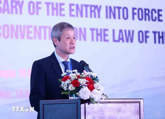 Assistant to the Foreign Minister Nguyen Minh Vu speaks at a ceremony to mark 30 years of the entry into force of UNCLOS, Hanoi, December 10, 2024. (Photo: VNA) |