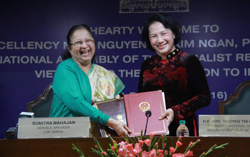 Both legislative leaders signed a cooperative agreement between Vietnam’s National Assembly and India’s Lower House, an agreement on joint use of nuclear energy for peaceful purposes; a MoU between Electricity of Vietnam Corporation and the Indian Energy Service Company, and an MoU between Vietjet Air and Indian Air on opening new air route.