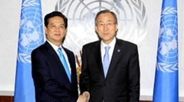 (VOV) - Vietnam will multilateralise and diversify its relations while accelerating its active international integration, becoming a reliable friend and partner and a responsible member of the international community, Prime Minister Nguyen Tan Dung has said. During his meeting with UN Secretary General Ban Ki-moon in New York on Friday, Dung announced Vietnam’s plan to join UN peace-keeping activities in 2014. He said Vietnam will actively contribute to the building of strategies and action programmes of the United Nations in various fields. He expressed his hope that the UN and the Secretary General will continue helping Vietnam in improving institutional capacity, human resources and policy consultations for the shift of the growth model, the solution of a number of social issues, and the climate change response.