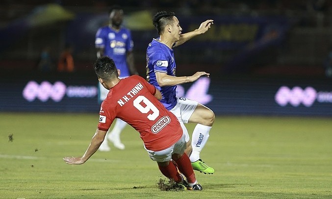 Do Hung Dung of Hanoi FC receives a dangerous tackle from Ngo Hoang Thinh of HCMC FC during a V. League game on March 23, 2021 (Photo: VnExpress) |
