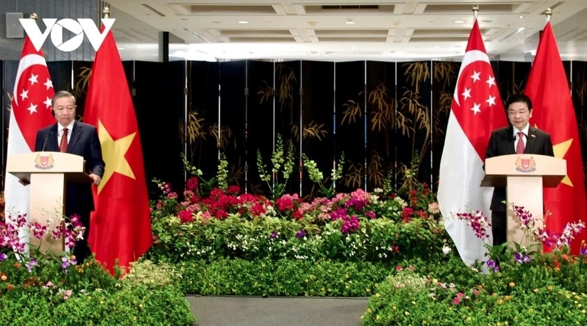 Party General Secretary To Lam and Singaporean PM Lawrence Wong brief the press following their talks (photo: VOV) |