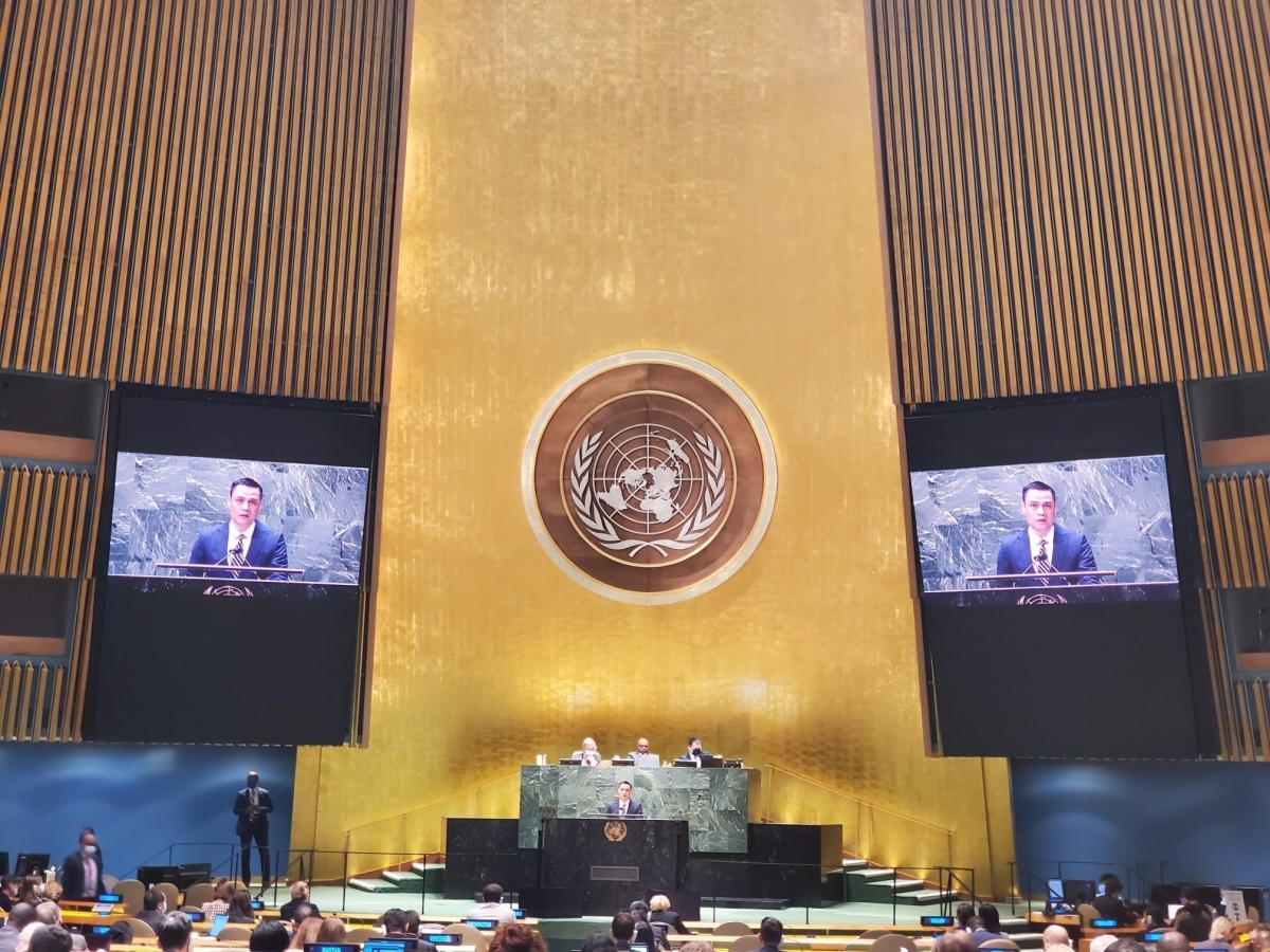 Ambassador Dang Hoang Giang speaking at a special session of the United Nations General Assembly. Photo: VNA |