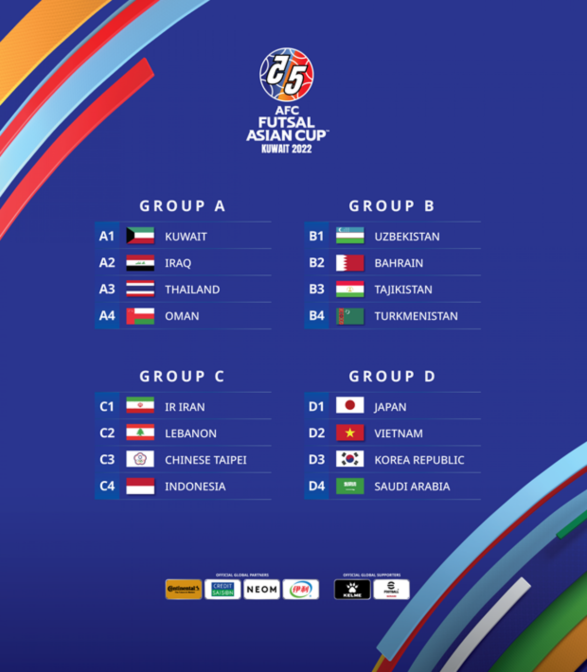 The AFC Futsal Asian Cup 2022 final round is scheduled to take place in Kuwait from September 25 to October 20. The tournament draws 16 teams divided into four groups competing in round-robin format.