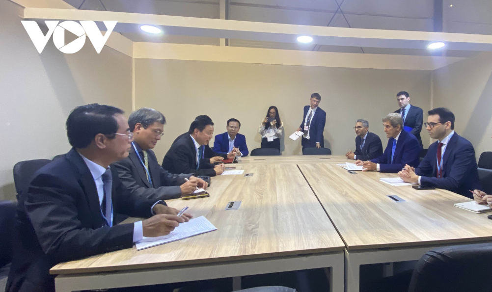 Minister of Natural Resources and Environment Tran Hong Ha meets with US Special Presidential Envoy for Climate John Kerry. (Photo: Ngoc Thach/ VOV reporter in Egypt) |