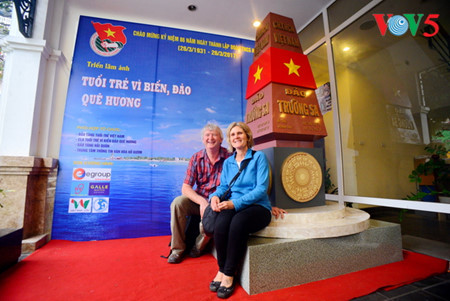 | A German tourist couple pose at the model of Truong Sa milestone at a photo exhibition “Youths for homeland sea and islands” in 2017. (Photo: Duc Anh) |