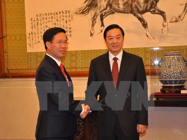 | Head of the CPV Central Committee’s Communication and Education Commission Vo Van Thuong (L) and head of the CPC Central Committee’s Publicity Department Liu Qibao. (Photo: VNA) |