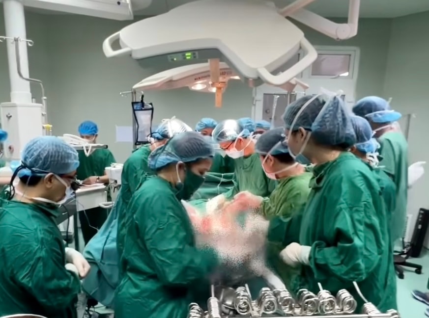 Surgery is simultaneously performed to remove and transplant the patient's heart and liver. (Photo credit: Vietnam-Germany Friendship Hospital) |