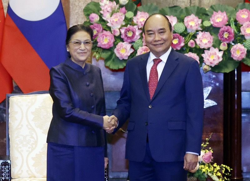 Vice President Vo Thi Anh Xuan (R) meets her Lao counterpart.