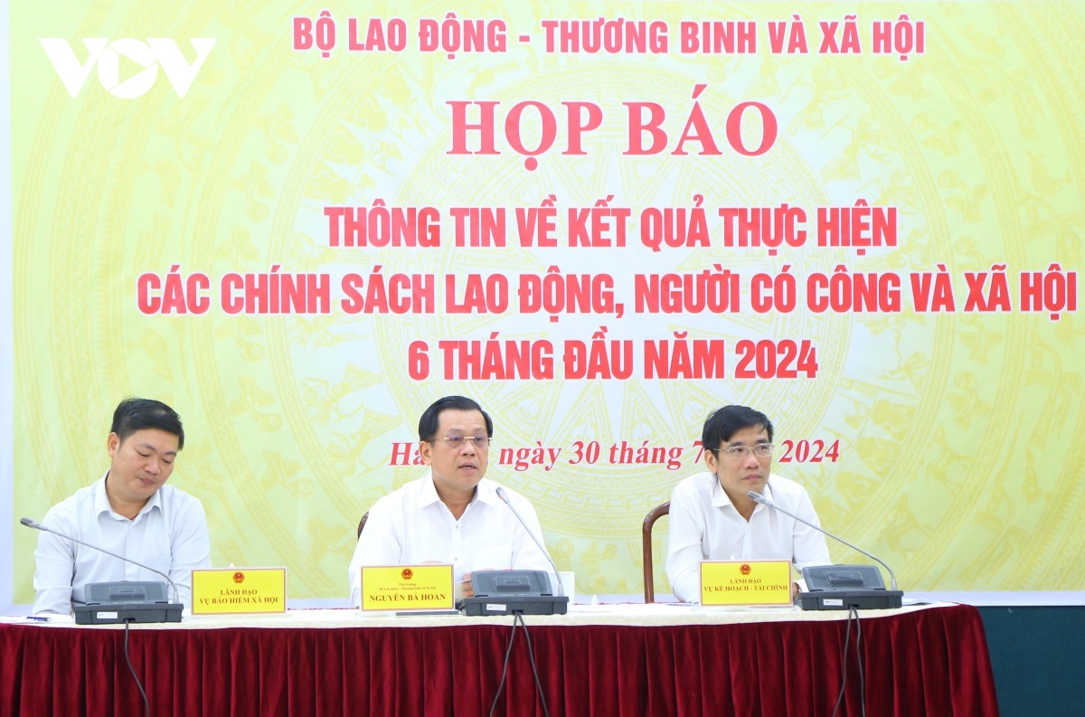 Deputy Minister of Labour, Invalids and Social Affairs Nguyen Ba Hoan (C) speaks a press conference on the implementation of social affairs policies, Hanoi, July 30, 2024. |