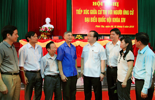 On Wednesday, Secretary of the Hanoi Party Committee Hoang Trung Hai met with voters of Ba Vi district. Candidates pledged that once they become NA deputies, they will try to improve the quality of legislative oversight, propose new ideas for socio-economic development, and pay more attention to disadvantaged areas.