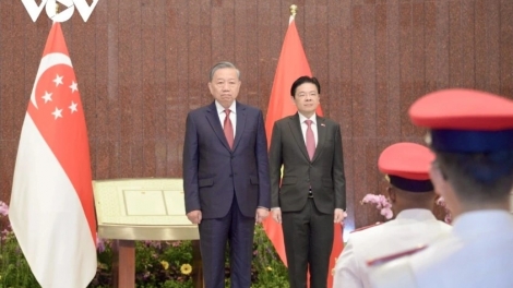 (VOVWORLD) - Singaporean Prime Minister and Secretary-General of the ruling People's Action Party (PAP) Lawrence Wong hosted a welcome ceremony for visiting General Secretary of the Communist Party of Vietnam (CPV) Central Committee To Lam on Wednesday morning.