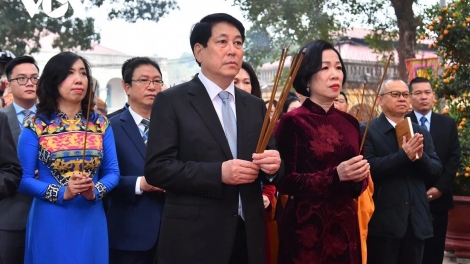 (VOVWORLD) - State President Luong Cuong, along with nearly 100 overseas Vietnamese, offered incense at Kinh Thien Palace in the Thang Long Imperial Citadel in Hanoi on Sunday to honor the nation's predecessors who dedicated their lives to national construction and defense.