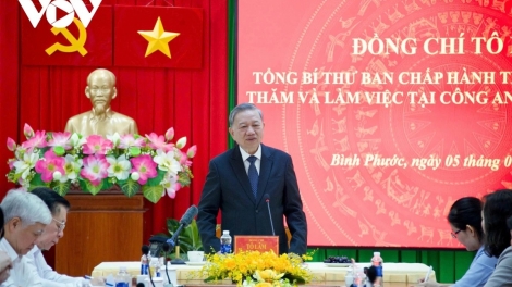 (VOVWORLD) -Party General Secretary To Lam on Sunday praised the Binh Phuoc provincial police for demonstrating its role as a leading force in protecting political security, maintaining border security, and ensuring social order and safety.