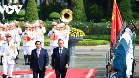 (VOVWORLD) - Vietnamese Prime Minister Pham Minh Chinh held talks with Chinese Premier Li Qiang after hosting an official welcome ceremony for the latter in Hanoi on Sunday.