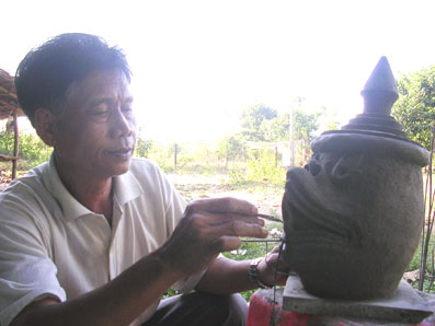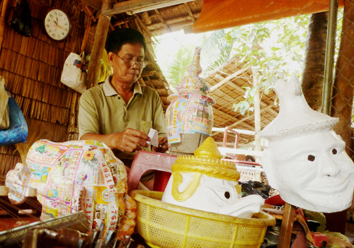 Lam Phen lives in Ba Se A hamlet, Chau Thanh district. He has a small carpentry workshop where he makes facemasks and clothing used for popular dancing and traditional stage arts of the Khmer. Phen and his cousin work day and night to fill the orders of a great number of pagodas and art troupes. Their products include stringed instruments, drums, and facemasks, which are indispensable in traditional Khmer dances. Phen began to produce Khmer cultural items and musical instruments in the 1990s. He said: “My father gave me the passion for Khmer traditional arts when I was little. During the time I was in Cambodia as a volunteer soldier, from time to time I visited an artisan’s house near the place we were stationed and learned his techniques for making Khmer cultural items.”