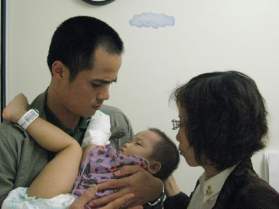 | Thien Nhan in the arms of father Nghinh and mother Mai Anh after the first surgery in the US (Photo: giadinh.net.vn) |