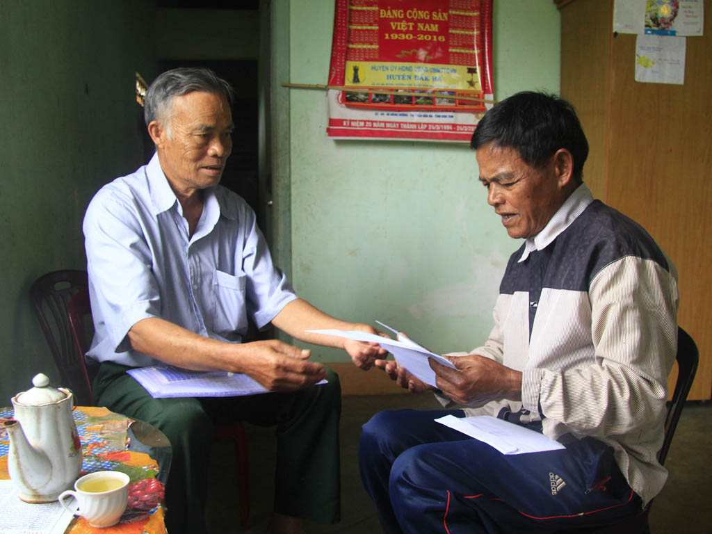 Mr. U Nia (right) talked to Chairman of Dac Ui commune’s Elderly Association.