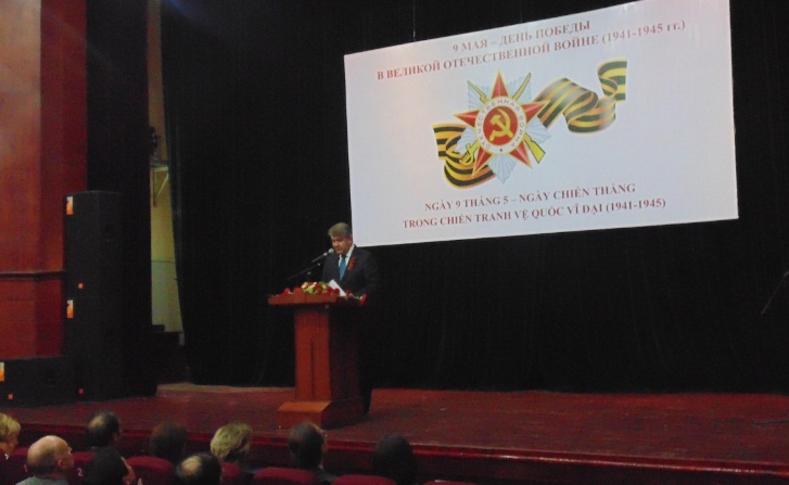 На церемонии празднования Победы в Великой Отечественной войне 1941-1945 годов состоялся показ художественного фильма известного российского режиссёра Карена Шахназарова «Белый тигр». Среди зрителей были представители дипломатических миссий зарубежных стран в Ханое, а также представители министерств и ведомств Вьетнама. Этот фильм – не просто рассказ об одном из эпизодов Великой Отечественной войны, это – философская притча о борьбе Добра и Зла. За историей главного героя видны сотни тысяч людей, благодаря каждодневному мужеству и самоотверженности которых и была выкована Победа. Чрезвычайный и полномочный посол РФ в СРВ Андрей Григорьевич Ковтун подчеркнул: «9 мая – священный для каждого россиянина день. Именно 9 мая 1945 года Красная армия окончательно сокрушила нацистские полчища, освободив мир от фашизма, предопределив исход Второй мировой войны. Мы никогда не делили Победу на свою и чужую. Она стала возможной благодаря совместным усилиям государств антигитлеровской коалиции, всех антифашистов. Вклад каждого был бесценен. Мы помним, что осенью 1941 года в ожесточенных боях под Москвой в рядах Красной армии сражались и вьетнамские воины-интернационалисты, пятеро из которых посмертно отмечены высокими наградами».