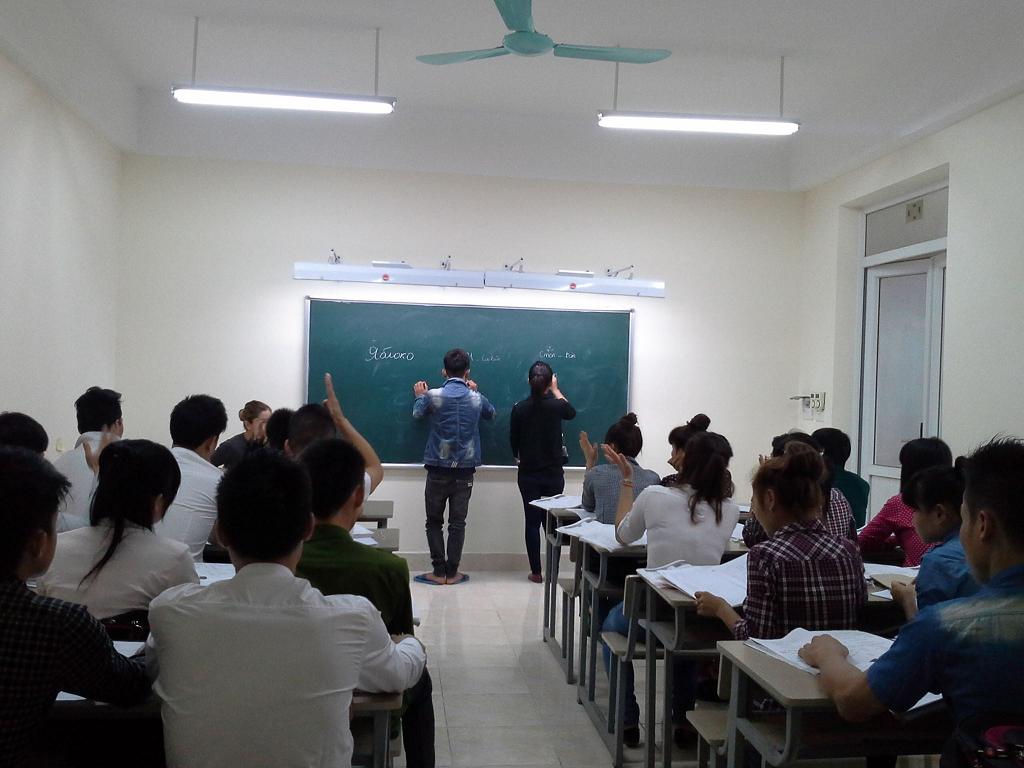 Как и в другие учебные дни, 25 студентов группы русского языка внимательно слушают преподавателей. В составе этой группы включаются сироты и дети из льготных, малоимущих семей, семей инвалидов войны и павших фронтовиков провинции Тханьхоа. Они уже окончили среднюю школу. Декан факультетата русского языка при Ханойском университете бизнеса и технологий Нгуен Суан Шон сказал: «Руководители провинции Тханьхоа, общество инвалидов совместно с Ханойским университетом бизнеса и технологий организовали бесплатную группу русского языка по подготовке экскурсоводов. Мы оторбрали 25 учеников, отвечающих интеллектуальным требованиям. Прошёл один месяц занятий и у учеников заметен прогресс. Сейчас они уже могут здороваться и говорить простые фразы на русском языке».