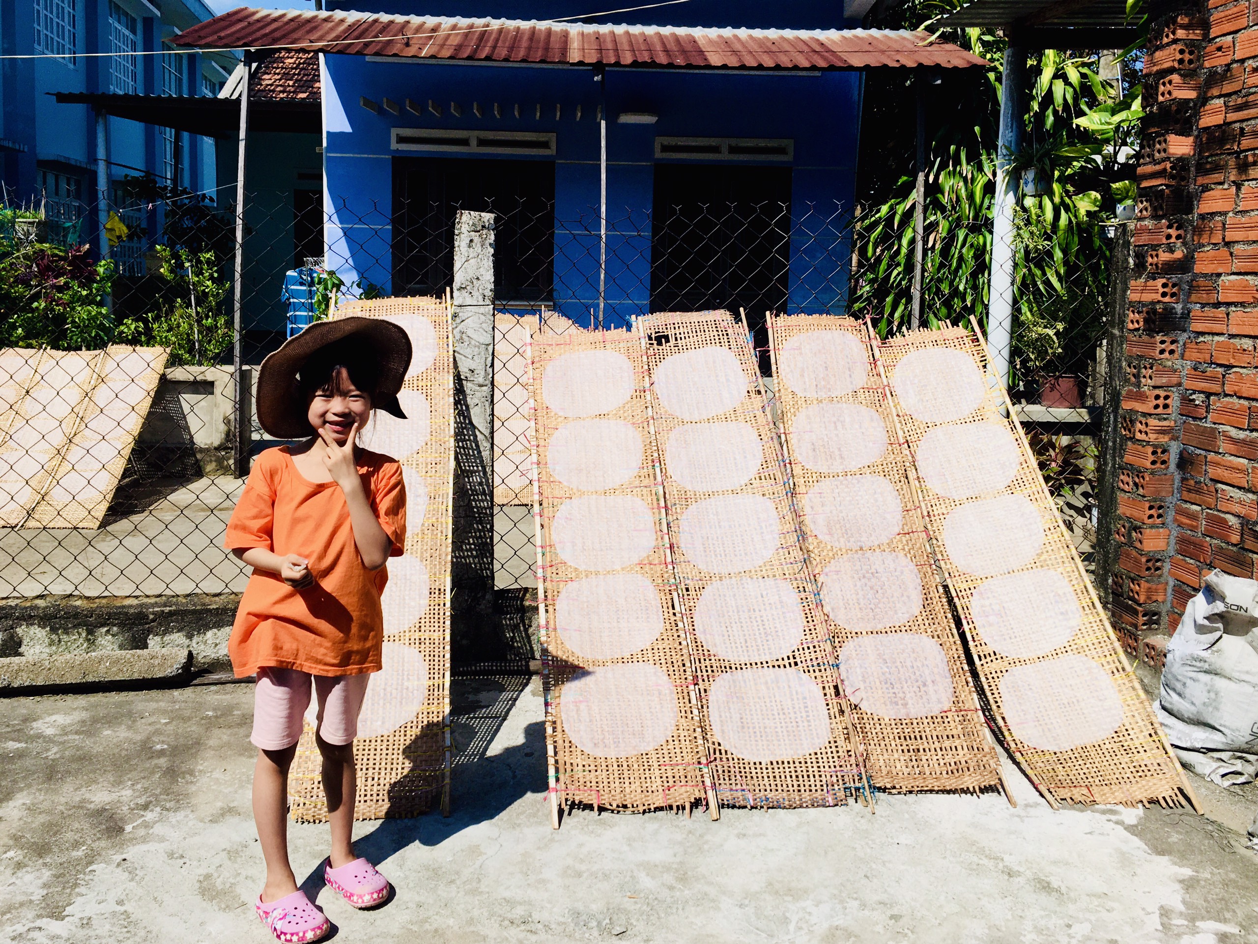 По небольшой дороге мы подошли к деревне. Здесь растет зеленый бамбук и деревья на развилке дорог. Стоят кирпичные дома, которые укрыты большими фруктовыми деревьями. Между домами проложены узкие дорожки, вдоль которых на небольшой высоте установленны сотни больших бамбуковых подносов для сушки рисовой бумаги под солнцем.