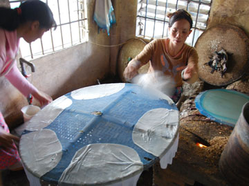 После набухания риса, из него готовят подобие блинного теста – размякшую рисовую крупу максимально быстро измельчают с помощью больших тяжелых ножей, выливают полученную массу на ткань, которая натянута над кастрюлей с кипящей водой, и держат там пару минут. Готовую галету можно есть сразу или свернуть в рулет с разными начинками, такими как отварная свинина, свежие овощи, вермишель и др.