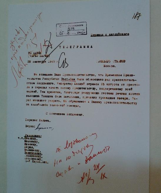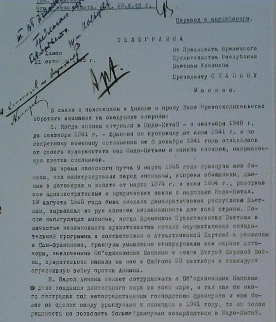 | Телеграмма от президента Хо Ши Мина Иосифу В. Сталину от 21 октября 1945 года в связи с положением в Аннаме. Фото: VOV/ Q.Khanh |