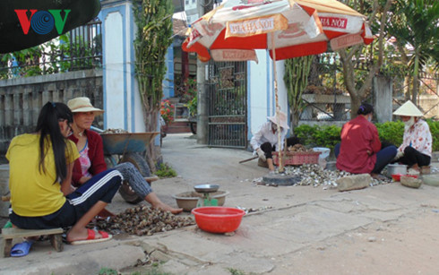 | Местные жители счищают устрицы с раковины. Фото: VOV/ Q.Khanh |