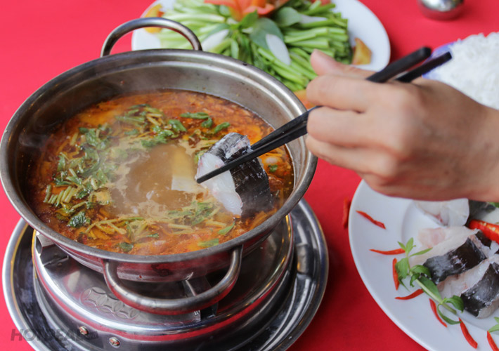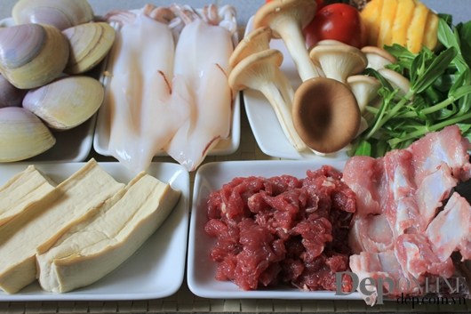 Также в бульон добавляют и некоторые ингредиенты по выбору: грибы, сухой кокос, репчатый лук и т.д. Приготовив бульон, вам остаётся лишь поставить его на плиту и ждать пока он вновь не вскипит. Вы бросаете в бульон разные продукты (мясо, рыбу, морепродукты, овощи, зелень, фрукты и даже вермишель) и вынимаете их приготовленными. Таким образом, сидя за столом, еда всё время остаётся горячей. Вьетнамцы часто едят хот-пот с рыбным соусом или приправами. Настя Рубик из России рассказала о хот-пот, который она попробовала в приморском городе Нячанг: «Мы взяли хот-пот на двоих за 139 тысяч донгов (примерно 6,6 доллара США). Заказ включает морепродукты, овощи и рисовую лапшу. Кроме этого, нам принесли тарелку рыбного соуса и приправы. Кальмар очень вкусный, потому что вкусным получился бульон».