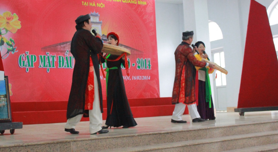 По случаю наступившего Нового 2014 года Синей Деревянной Лошади мы приняли участие во встрече земляков-уроженцев центральной провинции Куангбинь, которые проживают и работают в Ханое. В актовом зале звучала мелодия близкого всем собравшимся «гимна» провинции Куангбинь, что сделало атмосферу встречи более уютной и радостной для присутствующих. Среди них - пенсионеры, госслужащие и студенты ханойских вузов... Все люди пришли на встречу с общим желанием встречаться, общаться со своими земляками и рассказывать друг другу о своей жизни и работе. Господин Ха Ван Кан, глава Общества земляков уезда Куангнинь провинции Куангбинь в Ханое, сообщил: «Новогодняя встреча уроженцев провинции Куангбинь в Ханое стала хорошей традицией ещё 20 с лишним лет назад. Сегодня на этой встрече мы поздравляем пожилых земляков с днём рождения, поздравляем друг друга с новым годом и рассказываем друг другу о своей жизни и работе».