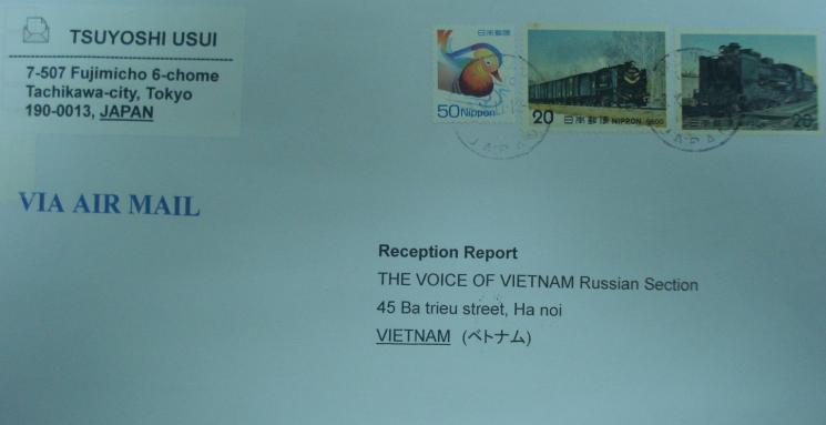 + Оценивая передачи радио «Голос Вьетнама», господин Цуёши Усуи из Японии говорит, что Голос Вьетнама является одной из его любимых коротковолновых радиостанций. Слышимость передач радио «Голос Вьетнама» очень хорошая в Токио, особенно ранним утром. Несмотря на то, что он не говорит по-русски, он может слушать наши русскоязычные передачи. Наряду с этим, он регулярно высылает рапорты о приёме передач в адрес японской, английской и французской редакций нашего Радио.