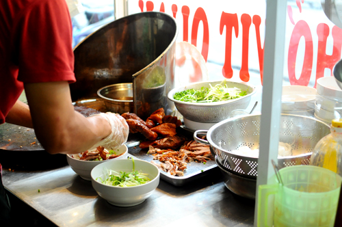 В чашку Фо в этом ресторанчике добавляют рисовую лапшу, приготовленную из тонкого рисового теста, зелень, специи, черный перец, глутамат натрия и зажаренное на вертеле утиное мясо. Утиное мясо, приготовленное с разными специями, приправами и травами, гормонично сочетающееся с рисовой лапшой и свежей зеленью, придает блюду восхитительный специфический сладковатый и кисловатый вкус. Нгуен Ван Тунг, главный повар ресторанчика «Фо с зажаренной на вертеле уткой» делится секретом приготовления жареной утки: «Утка должна быть молодой, но уже достаточно подросшей, крупной и мясистой, но нежирной. Сначала мы подготавливаем птицу, промывая ее, острым ножом пройдитесь по кожице птицы и удалите остатки перьев. Затем фаршируем утку, используя разнообразные приправы и травы: свежую зелень, черный перец, плоды клаузены. Затем зашейте утку, обмажьте ей со всех сторон медом и оставьте ее на 10 минут. Затем, жарьте утку на вертеле около 15 минут. При жарке обмазывайте утку заготовленным жидким медом. После этого, утку обжаривают на сковородке в масле, переворачивая мясо примерно 15 минут. Жаркое из утки требует правильного соблюдения температуры».