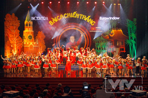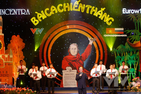 Прямая трансляция телемоста под названием «Песни победы» прошла в течение 3-х часов между двумя пунктами: Ханойским дворцом дружбы и Концертным залом гостиницы «Космос» в Москве. Более тысячи приглашённых гостей очень рано присутствовали в большом зале Ханойского дворца дружбы. Программа открылась песней «Священная война», переданной из Москвы в исполнении Центрального военного оркестра министерства обороны Российской Федерации, что напомнило о героической атмосфере, которая царила в России 70 лет тому назад. «Песни победы» была постановлена в направлении своеобразной художественной программы. Данная программа была призвана раскрыть информацию и архивы, касающиеся Великой Отечественной войны, страны России, рассказать о событиях, и особенно, о жизни и любви советских солдат к Родине. Всё это было изображено в русских песнях и мелодиях. На беседе с телеведущим в Ханое, особый приглашённый гость программы – передвочик Тхюй Тоан, который известен переведёнными с русского языка на вьетнамский произведениями литературы, поделился своими размышлениями о судьбе человека на войне: “Я думаю, что песни о Великой Отечественной войне сейчас ещё звучат не только в России, но и во многих странах мира. Это песни, которые нам очень нравятся. В произведениях литературы, а также в песнях, рассказывается о том, что мы маленькие, но очень великие. Сталкиваясь с испытаниями и трудностями в жизни, мы часто думаем, что мы очень маленькие, однако мы можем преодолеть их”.