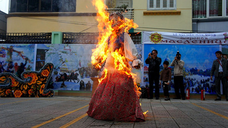 Нгуен Хыу Тиен Ань, студент Ханойского юридического университета сказал: «Это очень весёлый праздник. По сравнению с тем, что я видел в интернете, здесь намного интереснее. Все участники игр получили значимые памятные подарки».| Обряд сжигания чучела Масленицы. Фото: VOV/Ngoc An |