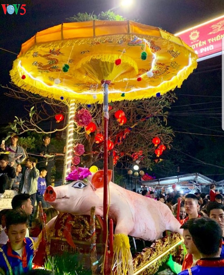 В день проведения обряда шествия с «господином Свинья» в 18:00 местные жители проходят со свиньями и ритуальными дарами по деревне под звуки барабанов. По местной традиции, обряд шествия проводится, в первую очередь, в селении, которое находится вблизи общинного дома, а потом, в самом далёком селении деревни Лафу. В 21:00 того же дня все жители направляются с дарами и свиньёй в общинный дом в соответствии с намеченным планом оргкомитета праздника. Ровно в полночь старожилы начинают совершать обряд жертвоприношения, который длится до двух часов ночи. По завершении обряда со свиньями шествие проходит по разным селениям деревни Лафу, и распределяют дары среди местных семей. Глава оргкомитета по проведению праздников деревни Лафу Нгуен Фан Дить сказал: «Раньше проводилось всего 6 обрядов шествия с «господином Свинья», затем – 11 обрядов, а теперь – 17, потому что в состав нашей деревни входят 17 селений. Несмотря на это, только 6 из 17 свиней могут быть привезены в «запретную зону», где находятся 6 алтарей соответственно. Ежегодно представители каждых 6 из 17 селений по ротации привозят своих свиней в «запретную зону». 2019 год — год Жёлтой Земляной Свиньи, поэтому обряд шествия с «господином Свинья» проводится более торжественно. Раз в пять лет мы проводим большой праздник, на котором с «господином Свинья» мы шествуем из общинного дома до места смерти духа-хранителя селения, расположенного в трёх километрах от общинного дома».