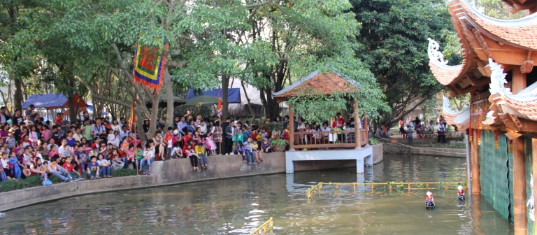 Всё действие происходит на воде, а именно – на большой красивой водной сцене. На трибуне более 300 зрительских мест. Туристы могут взять в руки и полюбоваться тысячами кукол разных размеров, а также познакомиться с процессом их изготовления. Мастер Нгуен Ба Тханг рассказывает: «Раньше куклы делали из хуры и фикуса, но сейчас в основном – из фикуса, потому что хуру очень трудно добыть. Берут свежий ствол старого фикуса, чтобы дерево было мягким, и его легче было резать».