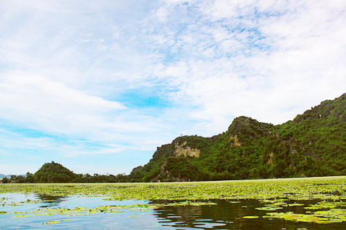 Озеро Куаншон имеет таинственную красоту. По словам местных жителей, раньше важные чиновники вьетнамской монархии часто собирались здесь, когда их созывали во дворец. Наверное, именно поэтому озеро имеет такое название: «Куаншон» на вьетнамоском языке означает «Чиновничья гора». Красота здешней природы покоряет сердца отечественных и иностранных туристов. В изумрудной воде можно увидеть отражение величественных гор, окружающих этот естественный водоём. Площадь озера составляет 850 гектаров. На ней разбросаны небольшие островки. Туристы очень любят плавать на лодках по этому озеру. Во время таких экскурсий им рассказываю местные легенды о происхождении этих гор и островов. Местный житель по имени Хунг рассказывает: «Острова и горы названы в честь животных. Остров, похожий на свиную голову, так и называется «Свиная голова». Есть и остров льва и гора слона. В лунные ночи гора буйвола очень похожа на настоящего белого буйвола».