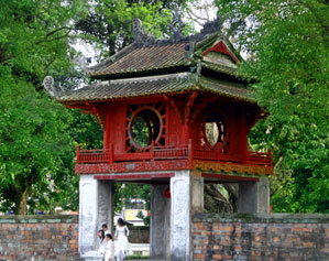 Иллюстрация «Вышка Кхуэванкак» Фам Нгок Туана передаёт культурные традиции целого народа через изображение первого в стране университета. В прошлом Храм литературы был культурно-образовательным центром всей страны. В работе Фам Нгок Туана содержится вечное стремление ханойцев к знаниям. Эта иллюстрация исполнена в современном художественнос стиле: в большом круге выразилось небольшие квадратики (во вьетнамском фольклоре круг и квадрат – это символы неба и земли, то есть космоса и нашего мира). Этот круг также является символом сохранения реликвий и культурных традиций. Квадрат внизу похож на ворота, за которыми скрывается мир знаний и светлое будущее. Можно сказать, что в свое работе Фам Нгок Туан смог описать главные черты Ханоя и гармонично сочетать народные традиции с современным искусством. По словам историка Ле Ван Лана, наряду с вышкой Кхуэванкак, в сознании ханойцев давно существуют и другие символы города: пагода на одном столбе, башня черепахи, озеро Возвращённого меча, башня пера, флаговая башня, императорская цитадель, древняя крепость Колоа и другие. Все эти достопримечательности являются неотделимой частью красивого города, Ханоя. Однако официальный символ должен сочетать в себе историю, современность и стремление будущему. Ле Ван Лан сказал: «Мы единодушно выбрали вышку Кхуэванкак официальным символом Ханоя, так как эта достопримечательность посвящена звезде Кхуэ – символу культуры и образования. Тем более, Ханой – тысячелетняя столица, крупнейший культурный и образовательный центр страны».