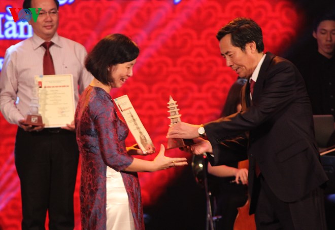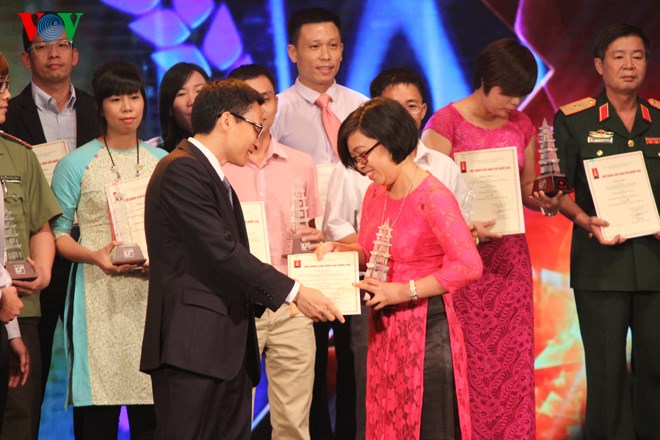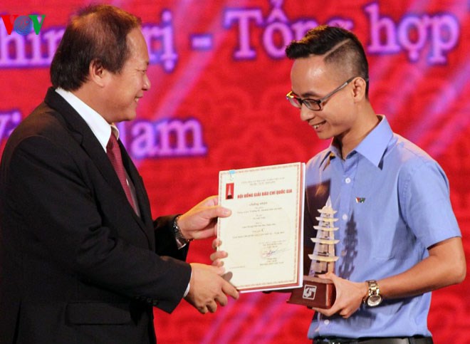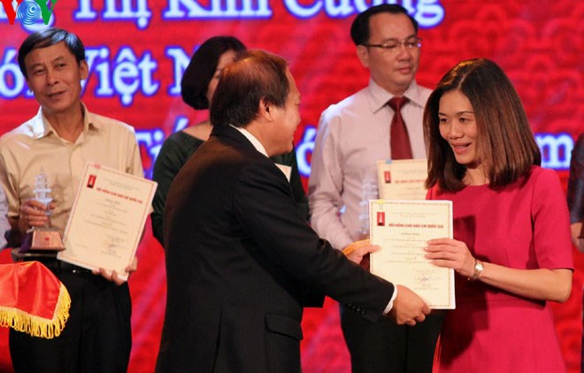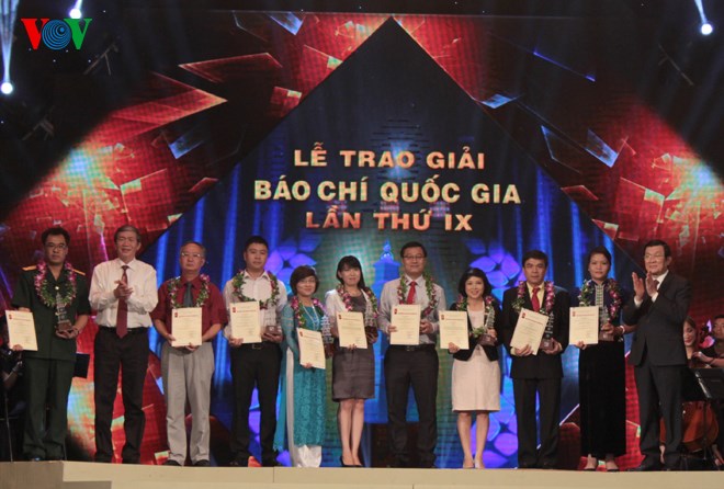 (VOV) - В воскресенье вечером в Ханое прошла 9-я церемония вручения премий победителям национального конкурса на лучшие журналистские произведения 2014 года в связи с 90-летием Дня вьетнамской революционной прессы (21 июня). В церемонии приняли участие президент Вьетнама Чыонг Тан Шанг, бывшие главы Компартии Вьетнама Ле Кха Фиеу и Нонг Дык Мань, высшие руководители Компартии, Государства и Правительства Вьетнама, представители министерств и ведомств, а также большое количество журналистов со всей страны.