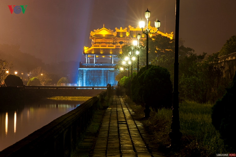 | Императорский дворец при династии Нгуен в ночное время. Его верхняя часть носит название «Павильон Нгу Фунг» или «Павильон Пяти Фениксов», где с балюстрады наблюдали за парадами, оглашали приказы и зачитывали лунный календарь. |