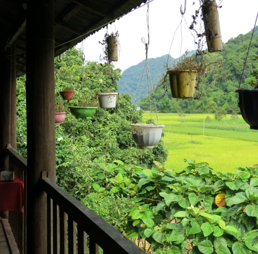 | Вид на рисовое поле и гору с балкона дома на сваях |