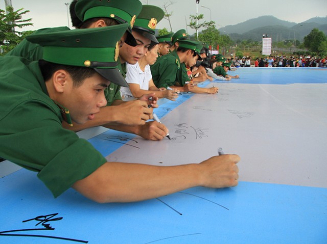 В Деревне культуры братских народностей Вьетнама также состоялась программа сбора подписей представителей всех народностей Вьетнама. Люди оставили свои подписи на гигантской карте размером 680 квадратных метров. Эту карту позже отправят военнослужащим и жителям островного уезда Чыонгша. Представитель малой народности Колао в северной горной провинции Хазянг Лыу Шан Ван стал одним из первых, кто оставил свою подпись на этой карте. Он сказал: «Программа «Братские народности Вьетнама обращают взор на родные острова» - очень полезное мероприятие, которое способствует объединению всего вьетнамского народа на защиту Родины. Сбор подписей на географической карте Вьетнама отражает чувство патриотизма и солидарность в деле строительства и защиты Родины, тем самым мы морально поддерживаем военнослужащих, охраняющих священные рубежи страны. В суровых климатических условиях наши солдаты продолжают защищать священный национальный суверенитет».