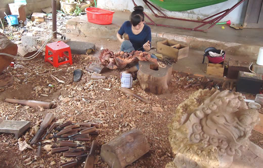 В 2005 году бонза Тхать Шуонг основал Клуб резьбы по дереву пагоды Ханг с участием нескольких десятков хорошо обученных бонз, задачей которых было передать это ремесло молодому поколению кхмеров и поставлять продукцию на рынок. Люди начали постоянно приходить в мастерскую, а деревянные изделия приобрели большую популярность. Полгода назад Шон Чум приехал сюда учиться из провинции Шокчанг. Он вспоминает: «Раньше я тоже был бонзой. Однажды я случайно увидел в газете фотографии высококлассных деревянных изделий, изготовленных в этой пагоде. Статуи священных животных, сделанные из пеньков, действительно очень красивые. Я решил приехать сюда научиться резьбе по дереву».