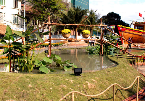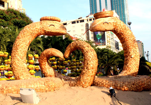 В эти дни город Хошимин кажется одевается в новые яркие костюмы. В центре города уже царит новогодняя атмосфера, многие дома улицы укращаются разноцветными лампочками и цветами. Многие проспекты в первом районе, расположенном вблизи базара Бентхань и собора «Богоматери», такие как Нгуен Зу, Донг Кхой, Нгуен Хюэ... украшаются электрическими фонарями и картинами с изображением Водяной Змеи - символа Нового года по лунному календарю - 2013. Многие магазины и дома на центральных проспектах украшаются гирляндами, переплетенными в большие букеты весенних желтых персиков, что придает городу своеобразную весеннюю красоту. И, наверное, самое яркое впечатление, которое производит на всех, кто посещает город Хошимин в эти дни: оживленная новогодняя атмосфера на празднике цветов на проспекте Нгуен Хюэ, где демонстрируются различные виды цветов и декоративных деревьев, привезенных из разных районов страны.