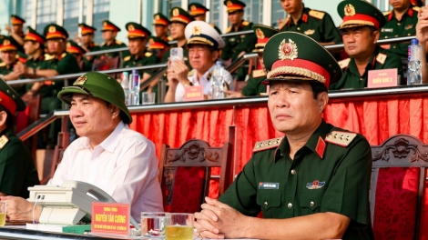 (VOVWORLD) - Утром 28 апреля на стадионе провинции Дьенбьен все 51 блок вооруженных сил приняли участие в тренировке парада в честь 70-летия победы под Дьенбьенфу (7 мая 2024 г.).