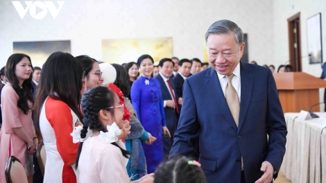 (VOVWORLD) - В рамках государственного визита в Республику Беларусь утром 12 апреля по местному времени генсек ЦК КПВ То Лам с супругой встретился с работниками и сотрудниками Посольства Вьетнама и представителями вьетнамской общины в этой стране.